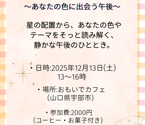 宇部ギャラリー 12/13(土)貸しスペースで「西洋占星術」の催しがあります 2025.11.23 12/13(土)13:00~16:00おもいでカフェのスペースを使って、西洋占星術のお茶会があります。占い師・ぺルラさんが、楽しくてためになる講座を開きます。ご自分の魅力に気付いたり、占星術の知識を深めたりしてみませんか?カフェのコーヒーとお菓子付きです。詳しくは、おもいでカフェのページをご覧ください。お申し込み・お問い合わせは、パキの鈴木までご連絡ください。 記事のタイトルとURLをコピーする Post Share Line note 11/1(土)緑につつまれたお寺にて… 前の記事