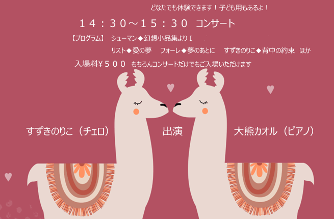 また、13:30からスペシャル企画『どなたでもチェロを体験できるコーナー』があります。触って音を出してみて、体でチェロを感じてみませんか?どなたでも大歓迎です。子ども用もご用意しています。
